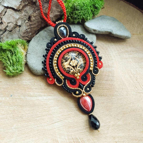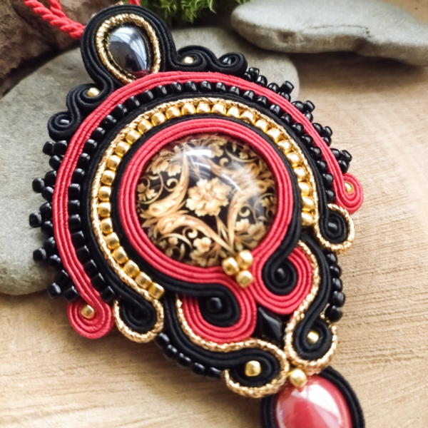 Elegancki nie duży wisior w barokowym motywie. Wisior wykonany jest ze sznurków sutasz w kolorach czerwono złoto czarnych, ze szklanym kaboszonem z grafiką, z małych kamieni hematytu oraz dużej ilości koralików.