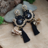 Eleganckie boho kolczyki z kwiatkami i chwostami. Kolczyki wykonałam ze sznurków sutasz w kolorze bezowym i czarnym, ze szklanych kryształków w kolorze złotym i czarnym, z taśmy cyrkoniowej i koralików w takich samych kolorach. ozdobiłam czarnym chwostem, koralikowym sznurkiem oraz kwiatkami w kolorze beżu.