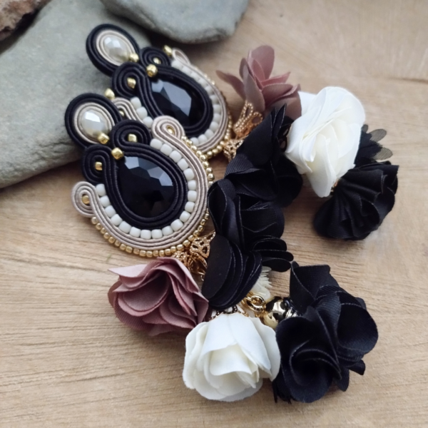 Eleganckie, okazałe i bardzo lekkie kolczyki sutasz w kolorze czarno, bezowo złotym. Kolczyki wykonałam ze sznurków sutaszm szklanych kryształków, koralików Toho oraz kwiatków.