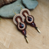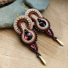 Kolczyki Brillant w wersji brązowej z dodatkami w kolorach jesieni. Kolczyki wykonałam ze sznurków sutasz, czeskich koralików, szklanych kryształków oraz taśmy cyrkoniowej.