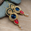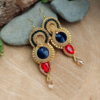 Nie wielkie, eleganckie i lekkie kolczyki Brillant w kolorze złotym z kryształkami w kolorze navy blue oraz czerwonym oraz taśmą cyrkoniową – ozdobione koralikami.