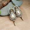 Kolczyki z modelu Brillant w odcieniach beżu oraz złota. Kolczyki wykonane są ze szklanych kryształków w kolorze złotym, beżowych sznurków oraz beżowych koralików.