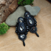 Proste i nieduże kolczyki z kryształkami. Kolczyki wykonałam w kolorach czarno granatowych, ze sznurków sutasz, szklanych kryształków, taśmy cyrknoniowej oraz dużej ilości koralików.