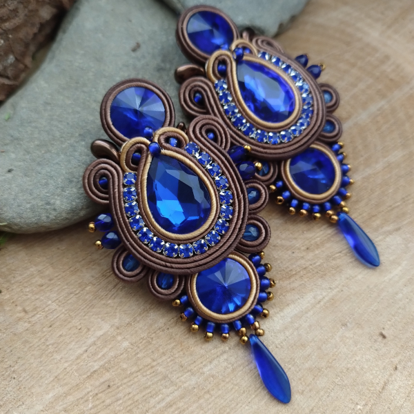 Eleganckie kolczyki w odcieniach brązu i kobaltu. Kolczyki uszyłam ze sznurków sutasz w kolorze brązowym, użyłam szklanych kryształków, koralików oraz taśmy cyrkonowej w kolorze kobaltowym.