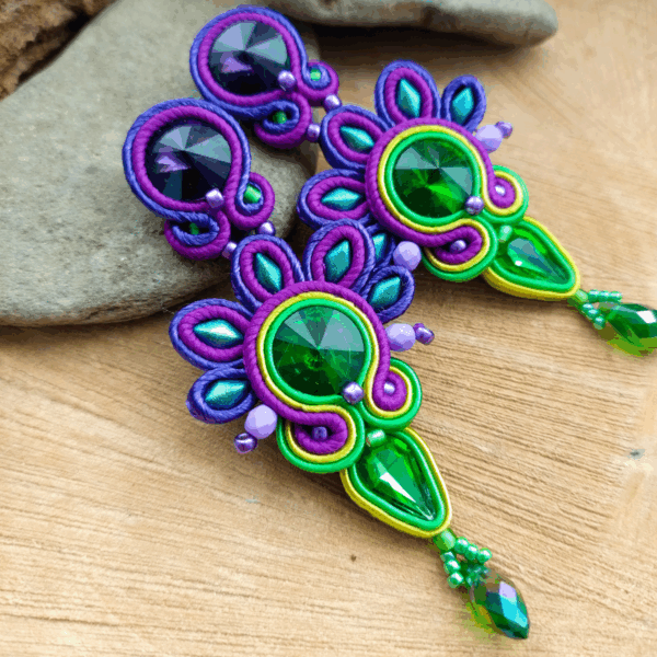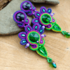 Najmodniejsze w tym sezonie kolczyki Felicja w kolorze fioletowo zielonym. Kolczyki wykonałam ze sznurka sutasz, szklanych kryształków, koralików, podszyłam welurem i użyłam zapięć ze stali chirurgicznej.
