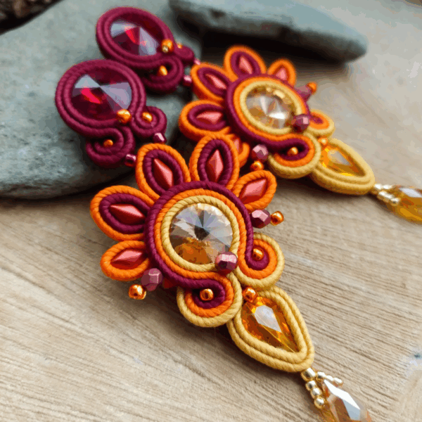 Kolejna wersja kolorystyczna modelu Felicja. Tym razem wybrałam jesienne kolory – bordo, pomarańczowy i musztardowy. Kolczyki wykonałam ze sznurków sutasz, szklanych kryształków oraz koralików różnego rodzaju.