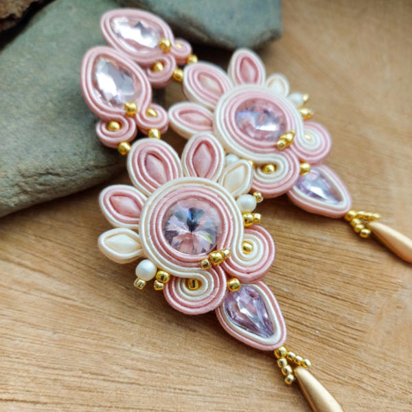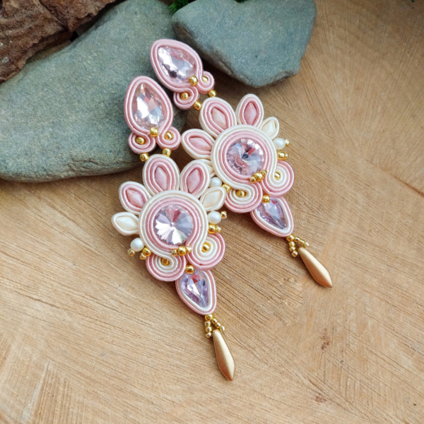Piękne i lekkie kolczyki Felicja w pastelowych kolorach : krem i pudrowy róż. Kolczyki wykonałam ze sznurków sutasz, szklanych kryształków oraz koralików.
