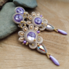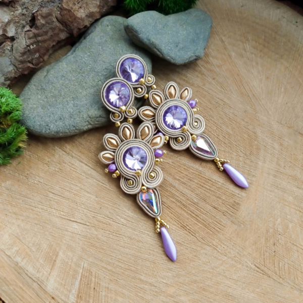 Niewielkie i lekkie kolczyki z błyszczącym sutaszem. Do uszycia kolczyków użyłam szklanych kryształków w kolorze lila, beżowych sznurków sutasz oraz koralików w tym samym kolorze.