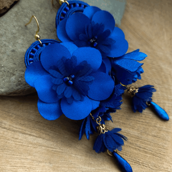 Piękne boho, kwiatowe i lekkie kolczyki kwiatki. Kolczyki wykonane są z różnej wielkości kwiatków materiałowych na łańcuszku przypiętych do bazy uszytej ze szklanego kryształku obszytego sutaszem oraz koralikami. Kolczyki są w kolorze kobaltowym ze złotymi elementami.
