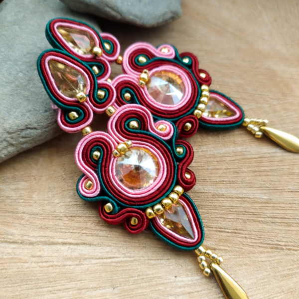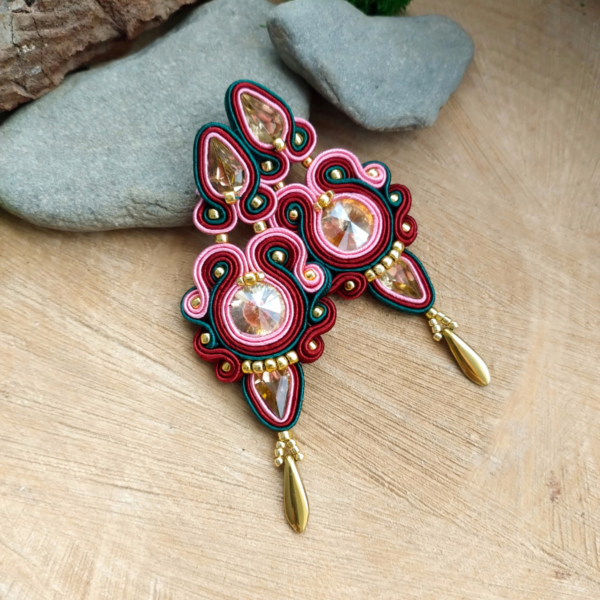 Piękne, nie duże i eleganckie kolczyki Grace w kolorach  : bordo, ciemna zieleń i róż. Kolczyki uszyłam ze sznurków sutasz w tych kolorach, szklanych kryształków oraz koralików.