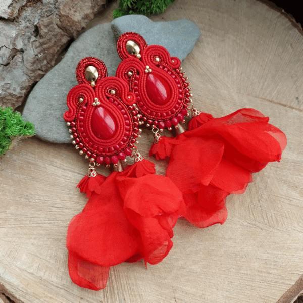 Długie boho kolczyki w kolorze czerwonym z syfonowym kwiatkiem. Kolczyki wykonane są z kamieni z żywicy, czerwonego sznurka sutasz, czerwonych i złotych koralików, materiałowych kwiatków, zapięć ze stali chirurgicznej oraz podszyte welurem.