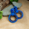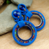 Proste kolczyki na bazie koła w kolorze niebieskim. Kolczyki wykonałam z różnych gatunków sznurków sutasz, taśmy cyrknoniowej, koralików oraz szklanych kryształków.