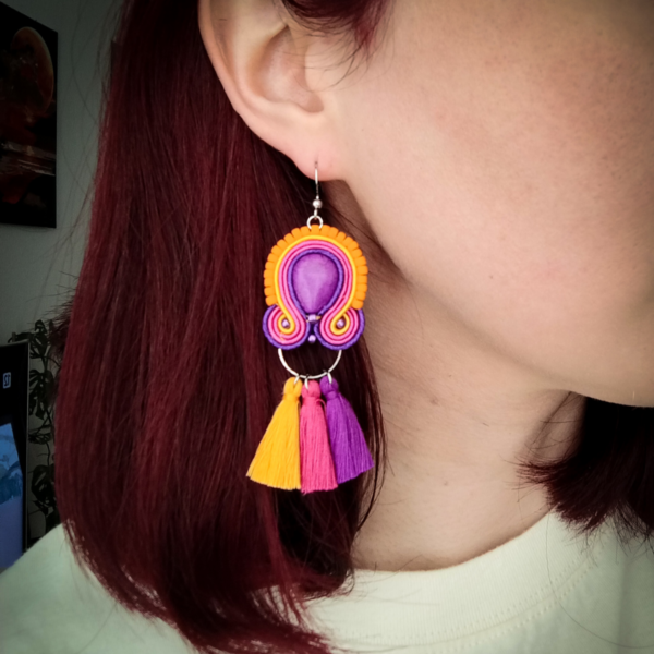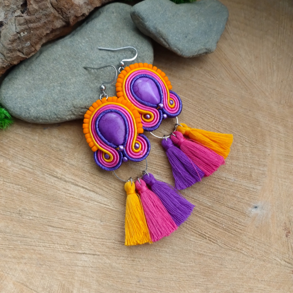 Letnie kolczyki w stylu boho z chwostami w kolorze fuksja, pomarańcz oraz fiolet. Kolczyki wykonałam ze sznurków sutasz, fioletowych howlitów, koralików i ozdobiłam chwostami na kółku.