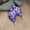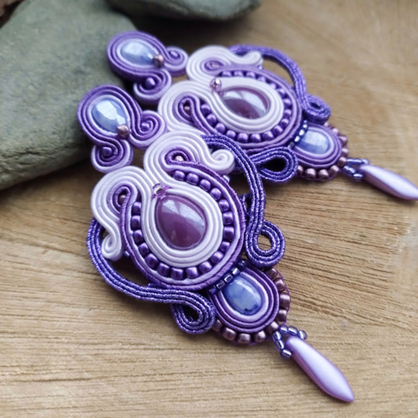 Fioletowe kolczyki z ceramicznymi kaboszonami. Kolczyki Magda wykonałam ze sznurków sutasz w różnych odcieniach fioletu – w tym metalizowanego, małych pastelowych koralików, koralików toho oraz Dagger.