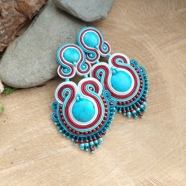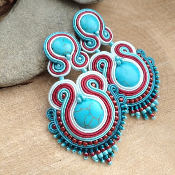 Niewielkie kolczyki w kolorze turkusowo bordowym z Howlitami. Kolczyki wykonałam ze sznurka sutasz w odcieniach turkusu oraz koloru bordowego, kamieni syntetycznych oraz dużej ilości koralików.