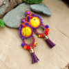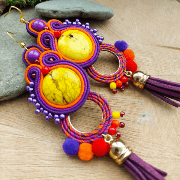 Kolorowe kolczyki w barwach jesieni. Kolczyki wykonałam ze sznurków sutasz w kolorze fioletowym i pomarańczowym, z koralików, żółtych howlitów, pomponów i zamszowych chwostów.
