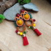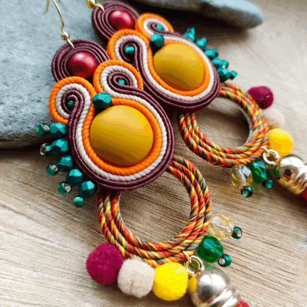 Niepowtarzalne kolczyki Misz Masz w kolorach Jesieni. Pierwsze kolczyki tego sezonu w cudownych żywych kolorach. Kolczyki wykonałam ze sznurków sutasz, koralików, kaboszonów z żywicy, pomponów i zamszowych chwostów.