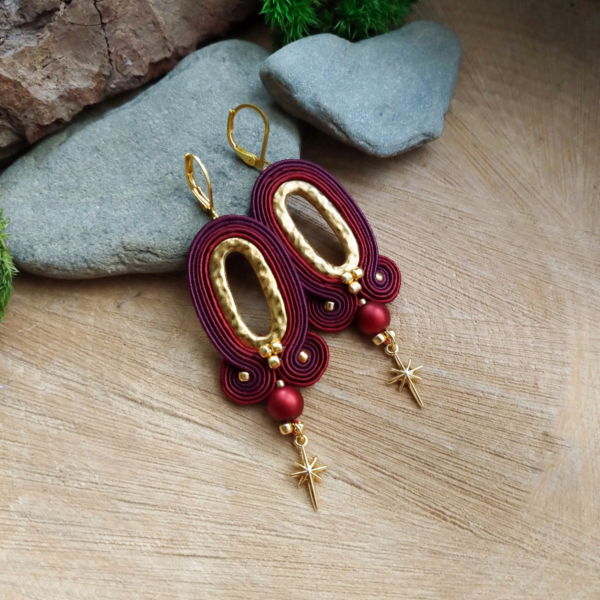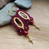 Niezwykłe i proste kolczyki na złotej falowanej owalnej bazie. Kolczyki wykonałam z bordowego i karmoniowego sznurka sutasz i ozdobiłam koralikami w kolorze bordowym i złotym.
