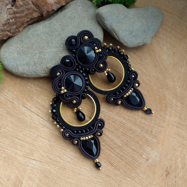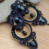 Geometryczne i lekkie kolczyki Nora w wersji czarno złotej. Kolczyki uszyłam ze sznurków sutasz, szklanych koralików, okrągłej złotej bazy oraz koralików.
