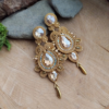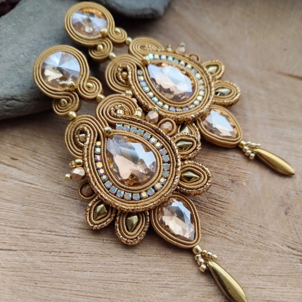 Kolczyki z modelu Queen w wersji całkowicie złotej. Kolczyki uszyłam ze sznurków sutasz – w tym metalizowany, ze szklanych kryształków, taśmy cyrkoniowej oraz koralików.
