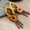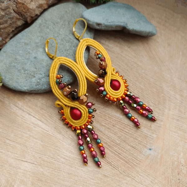 Nie duży i lekki ażurowy model w kolorach jesieni. Kolczyki wykonałam ze sznurka sutasz w kolorze musztardowym, dużej ilości koralików w różnych kolorach oraz zapięć ze stali chirurgicznej.