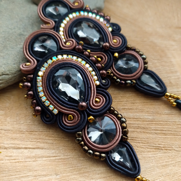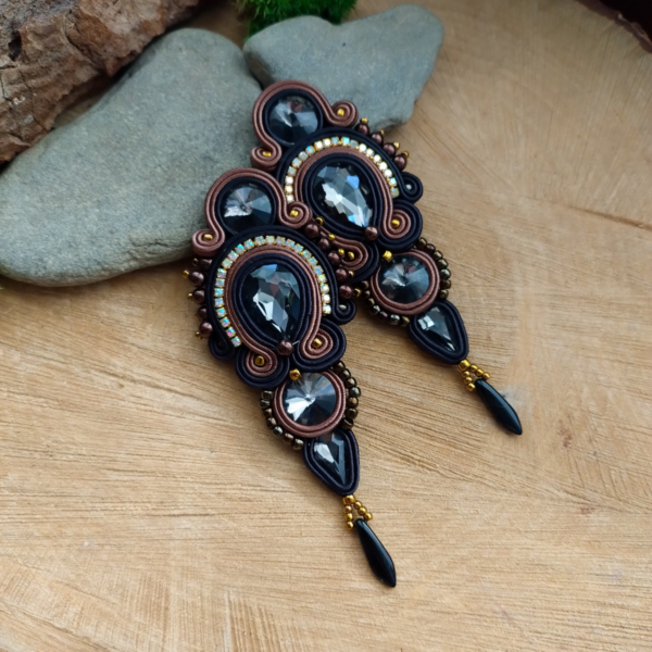 Eleganckie długie kolczyki w kolorach czerni, brązu i starego złota. Kolczyki wykonałam ze sznurków sutasz, szklanych kryształków, czeskich koralików oraz taśmy cyrkoniowej.