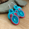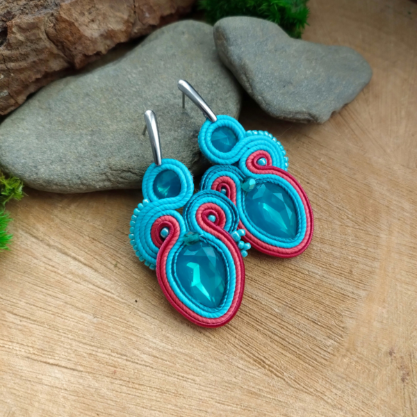 Kolczyki wykonałam ze sznurków sutasz i kryształków w kolorze turkusowo malinowym.