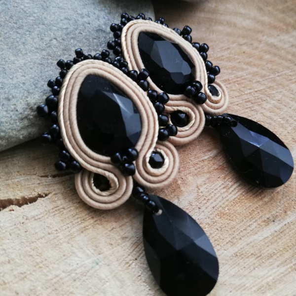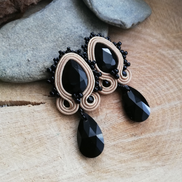 Małe kolczyki w dwóch kolorach uszyłam z czarnych kryształków Jet, które obszyłam beżowym sznurkiem z połyskiem oraz sznurkiem matowym. Ozdobiłam koralikami toho oraz kroplą kryształową w kolorze czrnym.