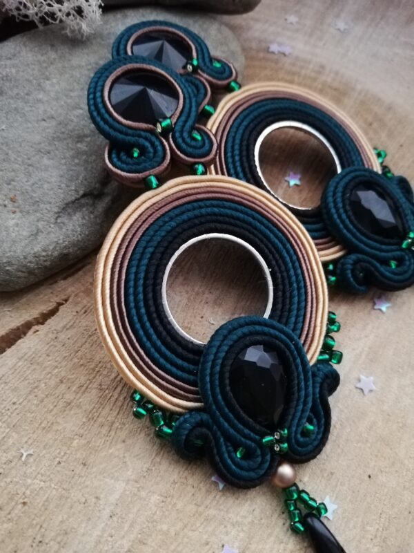 Niedługie geometryczne kolczyki w kolorze czerni, ciemnej zieleni, brązu i beżu. Szklane fasetowane kryształki, japońskie koraliki oprawione w sznurki sutasz.
