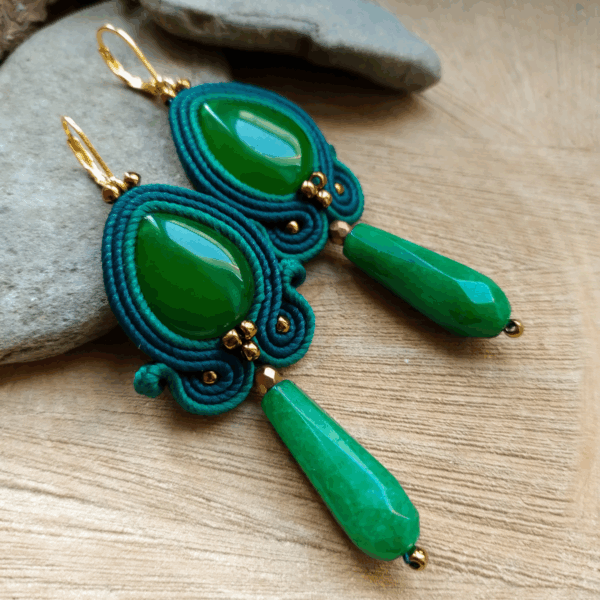 Piękne nie duże kolczyki z kamieniami w różnych kolorach. Kolczyki uszyłam ze sznurków sutasz, taśmy cyrkonowej, koralików i oczywiście kamieni syntetycznych. Kolczyki są w kolorze zielonym z Jadeitem.