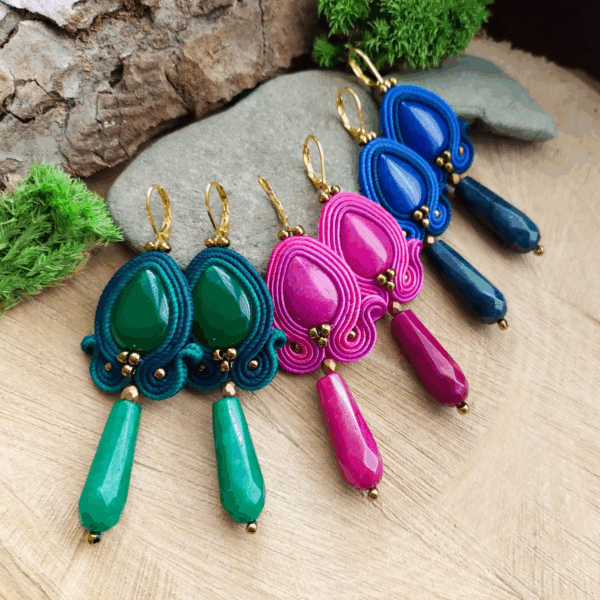 Piękne nie duże kolczyki z kamieniami w różnych kolorach. Kolczyki uszyłam ze sznurków sutasz, taśmy cyrkonowej, koralików i oczywiście kamieni syntetycznych. Kolczyki są w kolorze niebieskim z Jadeitem.