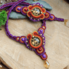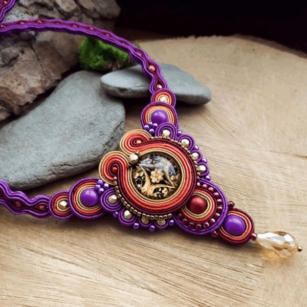 Wyjątkowy i niepowtarzalny komplet w stylu barokowym w jesiennych kolorach. Komplet wykonałam ze szklanych kaboszonów z grafiką, sznurków sutasz w kolorach – ciemny fiolet, wiśnia, rudy i musztardowy oraz metalicznych koralików.