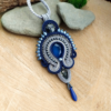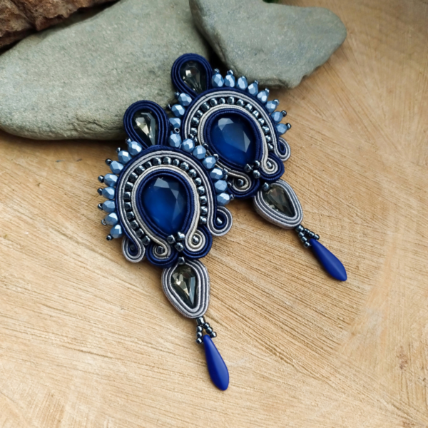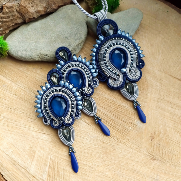 Elegancki komplet sutasz : kolczyki i wisiorek. Komplet jest w odcieniach szarości oraz w kolorze granatowym. Komplet wykonany jest ze sznurków sutasz, szklanych kryształków, cyrkonii oraz koralików.