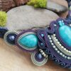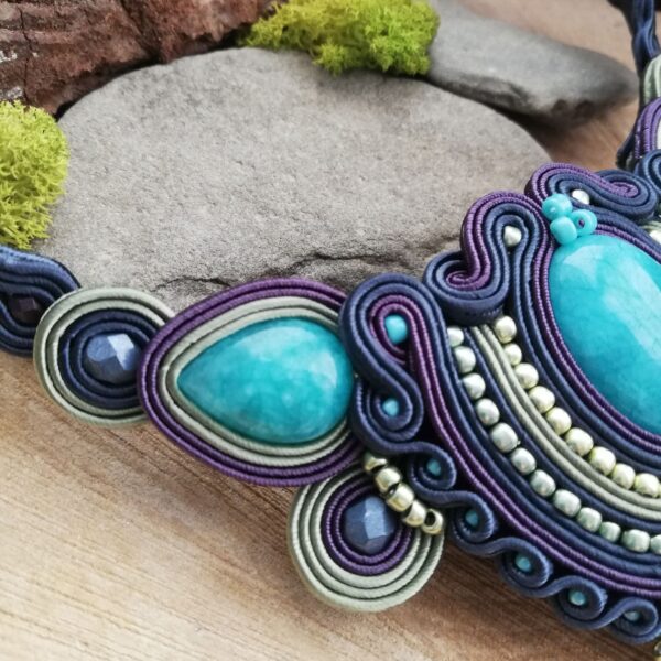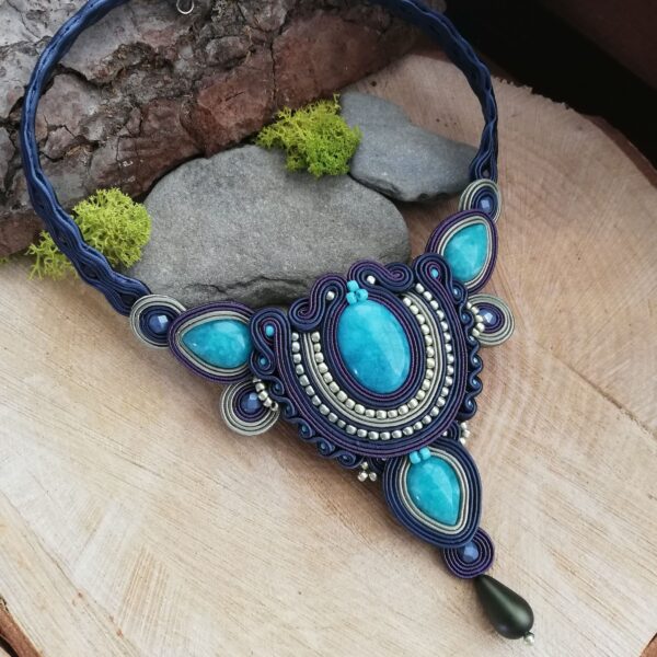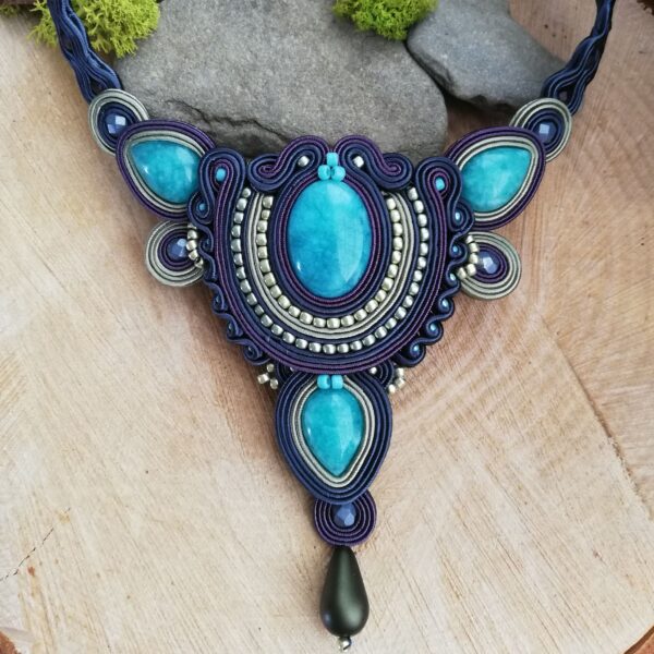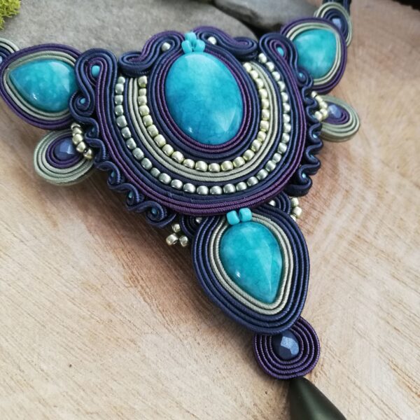 Piękny i okazały naszyjnik z Jadeitami w kolorze turkusowym o różnych kształtach. Granatowe i zielone sznurki sutasz w dwóch gatunkach obszyłam koralikami Toho aby elegancko otuliły te piękne kamienie. Naszyjnik bardzo fajnie układa się na dekoldzie. Nie jest za długi ani za krótki.