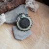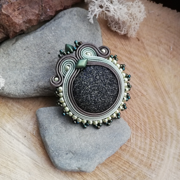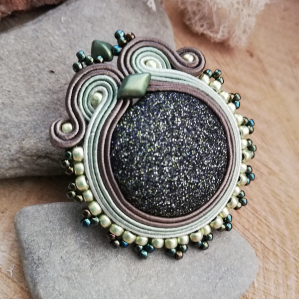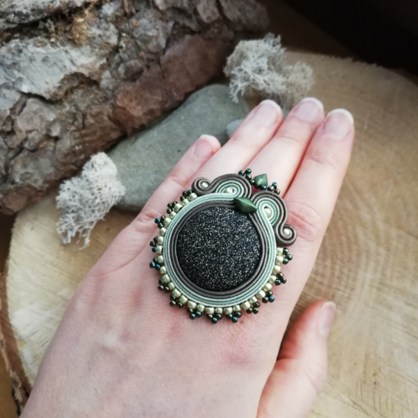 Elegancki i duży pierścionek w kolorze stonowanej zieleni z brokatowym kaboszonem. kaboszon obszyty jest włoskimi zielonymi sznurkami oraz ciemno beżowym sznurkiem. Dodatkiem są koraliki Toho oraz koraliki czeskie.