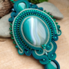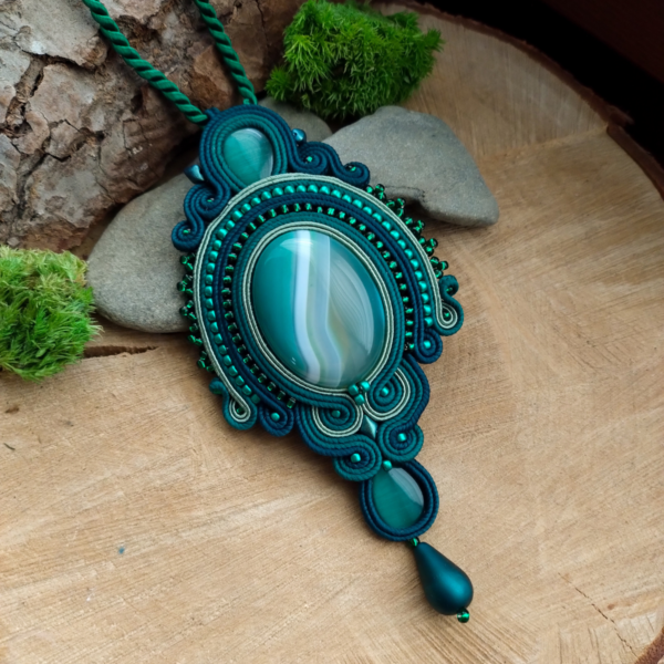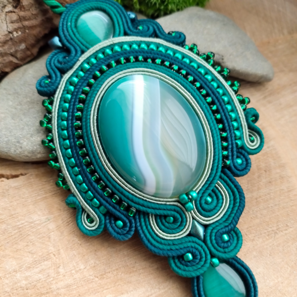 Wyjątkowy zielony wisior z kamieniem Agatu. Wisior wykonany jest ze sznurków sutasz w odcieniach zielonego, z kamieniem agatu oraz dużą ilością koralików.