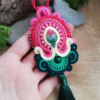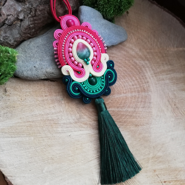 Piękny długi wisior z małym kamieniem Jadeitu Arbuzowego – czyli w kolorach arbuza. Obszyłam go sznurkami sutasz w kolorze malinowym, ciemnego różu, kremowym i dwóch odcieniach zieleni. Ozdobiłam perełkami i koralikami Toho w odpowiednich kolorach oraz długim zielonym chwostem.