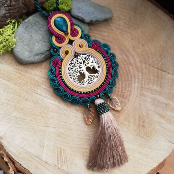 Wisior z motywem drzewa na metalowej bazie. Wyjątkowa ozdoba golfu, swetra lub sukienki dzianinowej. Kolorowy ale stonowany długi naszyjnik. Sznurki sutasz w kolorze beż, musztarda, bordo i ciemna zieleń, koraliki Toho ciemno zielone, szklane listki, długi wiskozowy beżowy chwost ozdobiony tymi samymi koralikami oraz szklany ciemno turkusowy kryształek u góry wisiora.