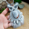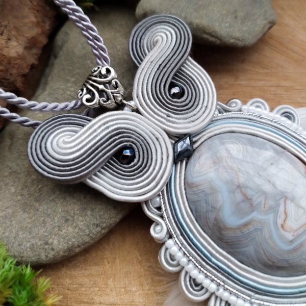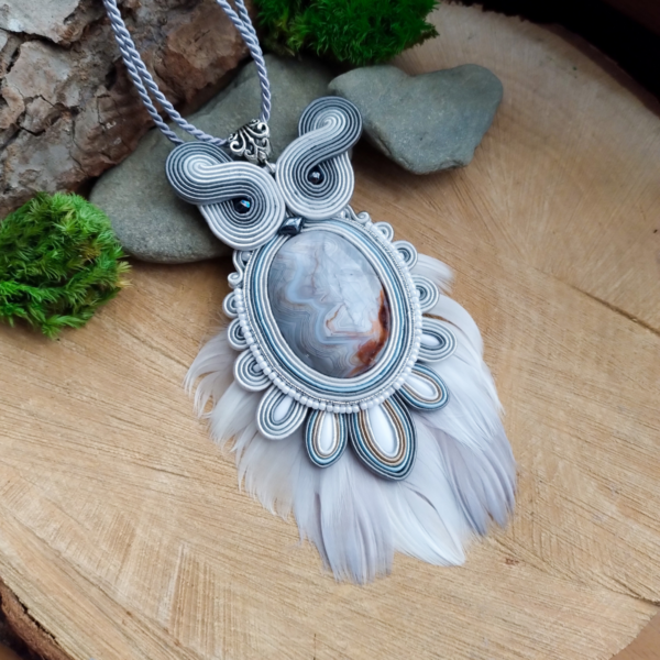 Długi naszyjnik, inaczej zwany wisiorem, wykonany w motywie Sowy z kamieniem naturalnym. Materiały jakich użyłam to sznurek sutasz w odcieniach szarości, beżu i jasnego niebieskiego, białe i szare koraliki, szare i białe piórka. Podstawą wisiora jest duzy kamień Agat Koronkowy.